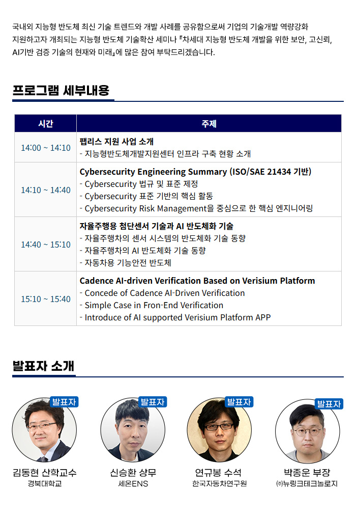 국내외 지능형 반도체 최신 기술 트렌드와 개발 사례를 공유함으로써 기업의 기술 개발 역량 강화를 지원하고자 하니, 많은 참여 부탁 드립니다.