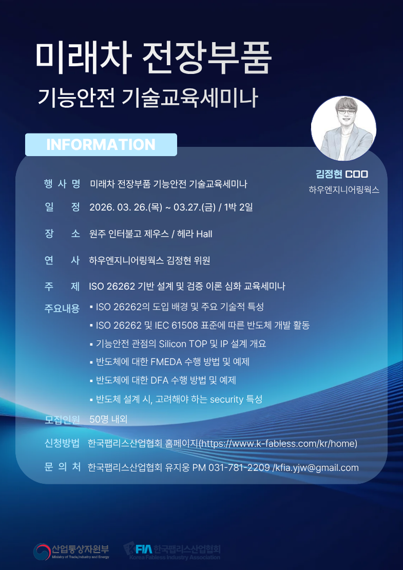 국내 팹리스 및 전장 부품 산업의 경쟁력 강화를 위한 '미래차 전장부품 기능안전 기술교육세미나' 를 개최하오니 많은 신청 부탁드립니다.